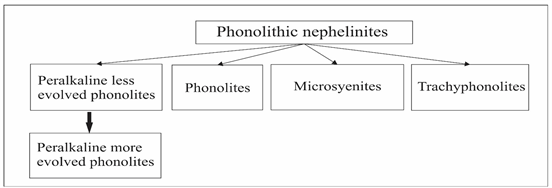 This research presented four groups of rocks. Three of them (phonolites s.s., amygdaloidal phonolites and trachyphonolites) are considered to be a direct derivation of nephelinite prime magmas with ultrabasic mantle sources (carbonated lherzolites). The possible main processes of differentiation are immiscibility of the nephelinite liquid, and fractional crystallization. A fourth lithological group, epidote phenites, is also interpreted in this study, as representative of the process of fenitization in granitic nesting rock.