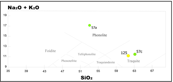 diagram. For the Le Maitre TAS diagram (Figure 8). Alkali values of up to 20% are considered in the rocks. According to schemes of bothauthors, the rock 57A should be classified as a phonolite and 57C and 125 as trachytes.