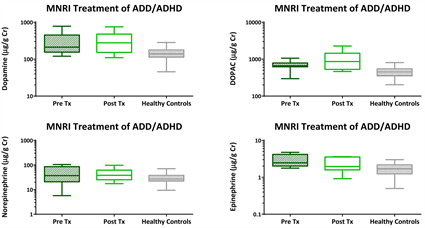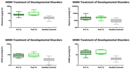 The present findings suggest that the MNRI treatment positively impacts central nervous, immune, and endocrine systems by regulation of the stress hormones and neurotransmitters regulation. The results indicate that through treatment using reflex patterns there is a reduction in the excitability within the nervous system, and reduction in the inflammatory response. All four study groups demonstrated positive changes that were generally small scale. The anxiety disorders group showed medium effect in the histamine response, and a large effect on the neurotransmitter taurine. The ADD/ADHD group had remarkable medium-to-large effects in most neurotransmitters. Neurotransmitter regulation can influence mood, behavior, focus, and cognitive functions. By regulation of the neurotransmitters and increasing the neuromodulation effect, the pathway for neurodevelopment, increase of stress resilience, neuroplasticity and new learning is facilitated. It is pertinent to note that modulation is achieved without the use of pharmaceuticals and their attendant risk of side effects.