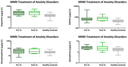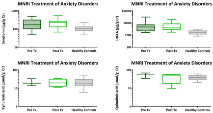 4) Study Group 4: Anxiety disorders (n = 10) were diagnosed with one or more of the following anxiety disorders: Anxiety (n = 3), OCD (3), and PTSD (n = 4). None of these subjects were taking medication or supplementation at the time of sample submission. Participants all were between the ages of 7 and 51 years (mean age 19 ± 18 years) with measured BMI between 17 and 35 (mean BMI 21 ± 6 BMI). 70% of the subjects were female and 30% male. All 10 subjects underwent the MNRI therapy program.