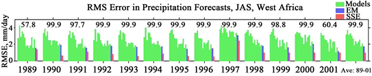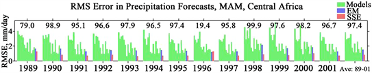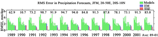 Figure 5 shows the root mean square error (RMSE) in forecasts of January-March (JFM) seasonal precipitation in East Africa for all the 13 years 1989-2001. The forecasts were made by each member model, the multimodel ensemble mean (EM), and by the multimodel synthetic superensemble technique (SSE). Comparing the RMSE of the members and EM, it is noted that the EM is a generally a superior forecast product relative to the individual models. For example in all the 13 years, it is only 4 cases where an individual model shows lower error than the EM. This outcome suggests that given a suit of models, the forecast made by a simple averaging of all the individual model forecasts is a product superior to the individual models, and it is these type of results that motivated the use of multimodel ensemble mean methodology that has been popularly used in many centers worldwide [8]. However, comparing the EM and SSE forecast as illustrated in Figure 5 by the last 2-bars for each year, it is seen