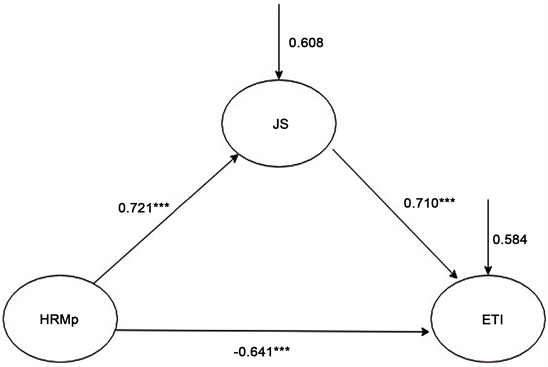 Figure 2. Estimated path diagram showing the mediating affiliation among HRM practices, job satisfaction and employee turnover intentions with standardized parameter estimates.