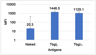Figure 3. Coupling confirmation of the TbgI2 and TbgI17 recombinant antigens coupled to Magplex beads by anti poly-histidine tag antibody in a multiplex format. The median fluorescence intensity (MFI) values are described on the Y axis while the types of antigens are indicated on the X axis.