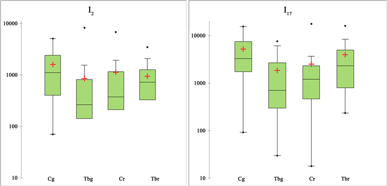 Figure 4. Boxplots showing the level of the fluorescence of the coupled TbgI2 and TbgI17 recombinant antigens tested with negative control Gambiense HAT sera (Cg); Positive Gambiense HAT sera (Pg); Negative control Rhodesiense HAT sera (Cr) and positive Rhodesiense HAT sera (Pr). The red crosses represent the means while the central horizontal bars correspond to the medians. The lower and upper limits of the box represent the 1st and 3rd quartiles while the whiskers are the values between the 1st and 3rd quartiles and the minimum and maximum values respectively. The points above or below the whiskers’ upper and lower bounds indicate outliers.
