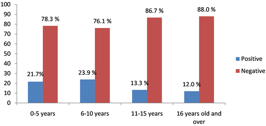 Although performed at different proportions, it is imperative in this study to compare the results of these two diagnostic tests submitted to the patients. Figure 4 gives the results of RDT performed in different structures. It is the age group of 6 to 10 years that the positivity rate is the highest (23.9%).