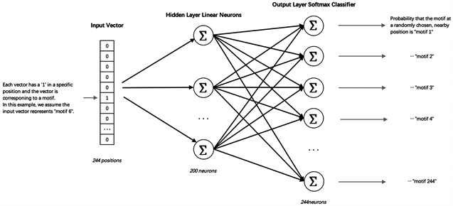 In our task, we assign each motif pattern with 200 features, so the corresponding vector has 200 dimensions. Therefore, the hidden layer can be represented by a weighted matrix with 244 rows and 200 columns, one column for each hidden neuron. The output is a one-dimensional vector with 244 entries, containing the probability for each motif pattern having the same type as a randomly selected nearby motif pattern (see in Figure 2).
