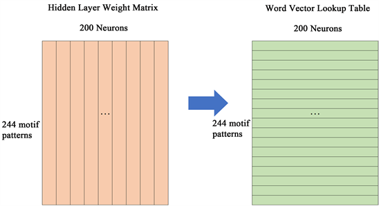 Figure 3. In the hidden layer weight matrix, each column represents the hidden layer neurons’ weights of one motif pattern. In the word vector lookup table, each row represents each motif pattern in the vector space.