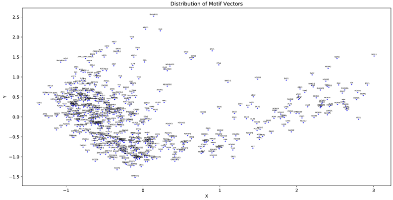 The word2vec algorithm transform words to vectors in high dimensions, which helps to cluster the feature of similarity, then the distance between each word can be presented. It has been a common way applied in the natural language processing. One paper [4] uses word2vec to find the semantic feature in Chinese language. In our paper, it is also utilized to identify the correlation between each motif. If two motifs appear jointly in different binding sites more frequently, then the distance between their corresponding vectors is shorter.