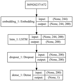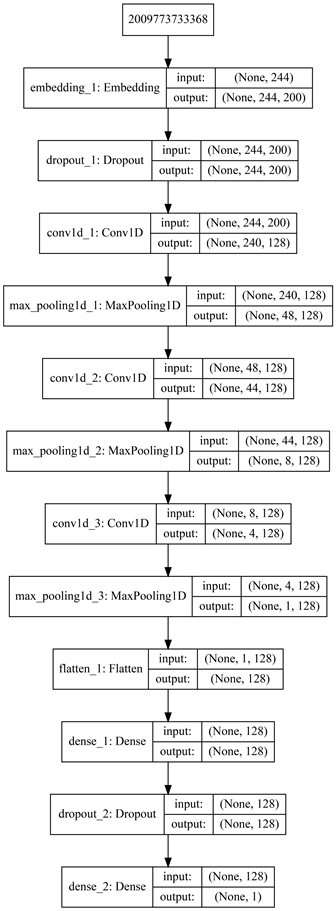 After we have 200-dimensional vectors, we apply Convolutional Neural Network (CNN) in one dimension for the sequential information and to fulfill the task of binary classification by extracting more features from the input. Firstly, we use an embedding layer to map each motif with its corresponding 200-dimensional vector, and input is all types of motif patterns (244 in total). For the second layer and before the last layer, we apply dropout to reduce calculating cost and avoid overfitting. Then, to extract main features and correlations between motif patterns and reduce parameters in calculation, we employ one-dimensional convolutional layer and max pooling layer respectively for three times. We also use flatten layer as a connection to transform the data into the form of input for the dense layer, which is also known as fully-connected layer. In order to output one-bit value for the binary classification, we choose sigmoid function as the activation function of last layer, and ReLU unit in other layers (see in Figure 5).