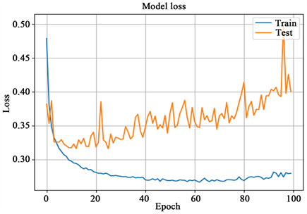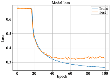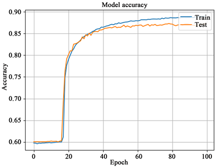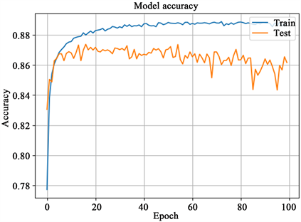 model extracts feature of motif patterns easily. When the epoch reaches 40, our model accuracy on the training set stabilizes, higher than 88%. The accuracy on our test reaches optimal at around the 20th epoch (in 100 epochs), which is 87%, and the loss increases after this point (see from Figure 7 and Figure 8). Similar results on both the accuracy and loss (Figure 9 and Figure 10) are achieved by RNN model for comparison (Figure 11). However, compared with the CNN model, the RNN model is more time-consuming for the same number of epochs (100 epochs), about 10 times of CNN. The reason for this is that every time after mapping and pooling, size of the data to be processed by the network reduces.