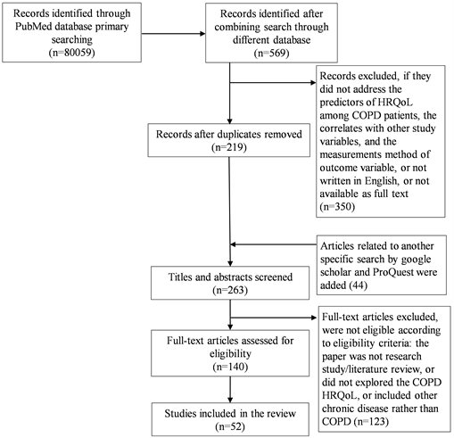 The potential articles were first screened for their titles and abstracts. Then, the relevant articles were reviewed in full for consideration of inclusion in the current review. The selection was according to fixed inclusion and exclusion criteria. The primary search in PubMed databases retrieved (80059) articles including research articles and systematic reviews and (44) articles through other resources. After combing three specific variables (anxiety, fatigue, and uncertainty) in the same search engine, (569) articles were identified. After removing duplicates (219) articles were identified. (350) records were excluded because they did not meet the inclusion criteria. From the reviewed titles and abstracts, (140) articles met our search criteria and were reviewed in full. Afterward, the selected articles were assessed for eligibility based on their full text. Of these, (52) final articles were selected. The relatively low number of articles was reflected in the scarcity of evidence around the study variables. After an in-depth review of the included articles, results were summarized according to the following two headings: predictors of HRQoL among COPD patients and the correlation between HRQoL and other specific variables. Figure 1 demonstrates a flow chart for the selection of studies included in the literature review.