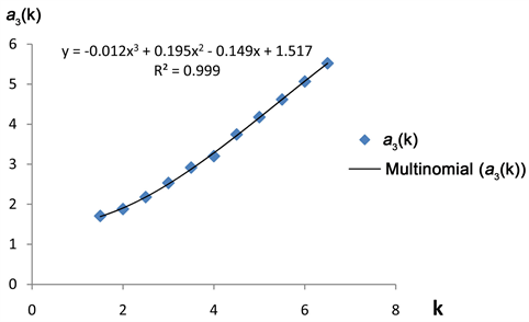 was obtained from tables. Then a3 (k) was calculated by using Equation (37). Figure 3 shows a plotting of a3 (k) against k.