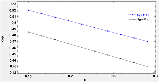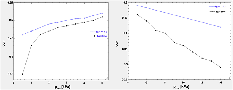The effect of the condensation temperature on both the thermal performance coefficient and the specific cooling capacity was studied using four variable values of the evaporating temperature of the generation and absorption temperatures, as shown in Figure 5. It was determined that with the increase of the temperature of the condensation, both the performance coefficient and the qualitative capacity decrease. The objective of decreasing the performance factor was to reach the required generating temperature (Tg), performance coefficient COP = 0.5 at a temperature of condensation Tcon = 33˚C.