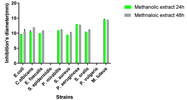 Figure 1. Inhibitions’ diameters of the methanol extract on reference strains as over time (24 h and 48 h).