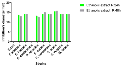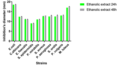 Figure 2. Inhibitions’ diameters of residual ethanol extract on reference strains over time (24 h and 48 h).