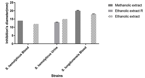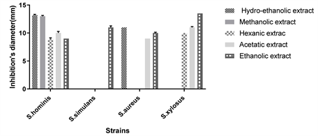 The sensitivity of clinical strains of Staphylococcus to our extract is shown in Figure 5. We note that the largest diameter of inhibition (20 ± 0.08 mm) was observed on Staphylococcus lungdunensis strain with the methanol extract. Apart from methanol and ethanol residual extracts residual that inhibited each 33.33% (1/3) of strains, hexane, acetate and water-ethanol extracts showed no inhibitory effect on multi-resistant strains of Staphylococcus.