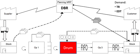 The triggering of production is based on the DBR technique (Drum-Buffer-Rope). The drum (pace maker) is supplied by pulled supermarkets. Different supermarket location principles are possible: shared centralized or decentralized at POU (Point of Use) with different possible storage principles now also served by AGVs (Automated Guided Vehicles). With that Toyota introduced the asynchronous assembly principle. American academics took over this revolutionary concept and divulged it in the 90ies (e.g. Liker 2004).