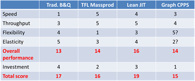 elasticity (Rüttimann & Stöckli 2016). The summary reveals that the Lean JIT production system will dominate, combining the benefits of job-shop flexibility and TFL efficiency. High investment with high BEP implies low elasticity which penalizes the CPPS. Such systems have to be well conceived. Rather than trying to implement an omnipotent system, a well thought-out and confined optimal application range has to be envisaged. However, it has to be stated that also the other production systems have to invest in digital technologies so that the overall performance score represents the reality better.