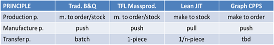 If we leave out the benefit of ongoing digitization of production, from which also the other production-type systems will benefit, it is perceivable that this Industry 4.0 manufacturing concept is mainly based on autonomous scheduling of intelligently interacting devices, but still bases on a low performing B & Q structure if it is not TFL or TPS-based. Let us call this new type of shopfloor manufacturing system “graph-based intelligent CPPS” not yet specifying further the underlying adopted principles until the high-flying dreams of the i4.0 action