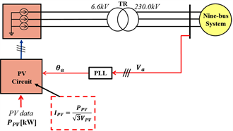 Figure 5 shows PV model used in this paper. In this study, the PV model is expressed by a simple model using current sources, in which kilowatts data, PPV [kW], is used. Therefore, PV current (IPV) is calculated from PPV [kW] and PV voltage, VPV [kV], and the obtained current (IPV) is entered to the current sources.
