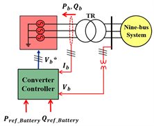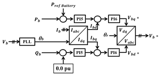 Figure 9 shows battery model used in this paper. The battery model is expressed by a simple model using voltage sources. Qref_Battery is fixed at zero. Figure 10 shows the control model of battery converter that converts from three-phase AC to DC voltage. The parameters of PI controllers used in Figure 10 are shown in Table 3.
