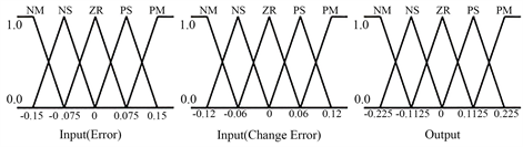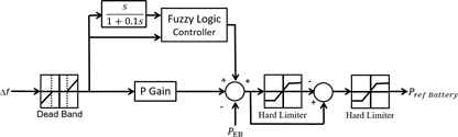 Figure 11 and Figure 12 show the fuzzy PD based virtual inertia control systems for the HVDC interconnection line and the battery proposed in this paper. The controller for the HVDC line shown in Figure 11 is composed of PD controller in which D controller is based on FLC (Fuzzy Logic Controller). As differential value of the system frequency is used in the FLC, it can generate virtual inertia output component, and thus, it makes it possible to respond quickly to sudden frequency fluctuations. Figure 13 and Table 4 show the membership functions and fuzzy rule base designed for the FLC.
