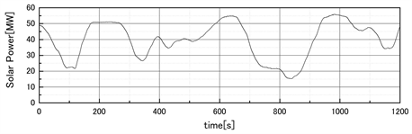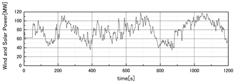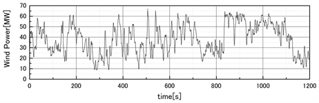 Simulation analyses have been performed in the 6 cases shown in Table 5 to confirm the effectiveness of the proposed method. Figure 16 shows the wind speed data and Figure 17 shows the resulting output of WF used in the simulation analyses. Figure 18 shows the PV data used in the simulation analyses. Figure 19 shows the total output of WF and PV station. The data used in Figure 16 and Figure 18 were real data measured in Hokkaido, Japan. The simulation time was 1200 seconds and PSCAD/EMTDC software was used for the simulation analyses.