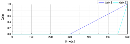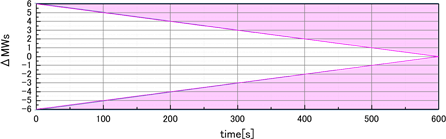 In order to confirm the effectiveness of the proposed method, the energy balancing control for 10 minutes is performed twice in the simulation for 1200 seconds, i.e., 0 to 600 seconds and 600 to 1200 seconds. As shown in Figure 20, two types of gains are used in the control block shown in Figure 14, where gain I increases linearly from 0 at t = 300 seconds to 1.0 at t = 600 seconds and gain II increases linearly from 0 at t = 550 seconds to 1.0 at t = 600 seconds. On the other hand, Variable Dead Band is used in the control block shown in Figure 15, of which threshold value becomes gradually narrower from ±6 [MWs] at 0 seconds to 0 [MWs] at 600 seconds as shown in Figure 21. In Figure 21, the white area is dead zone, and if ΔMWs exceeds the pink line, which is the threshold line, the energy balancing control is activated. Interval of the integration of Equation (7) for ΔMWs is set to [0, 600].