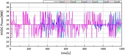fluctuation in the positive side exceeds 0.2 Hz. This is because the variations of HVDC transmission line power for controlling the system frequency fluctuations reach the permissible control range in the transmission power on HVDC interconnection line. The best results are obtained in Case 3 for both the maximum and standard deviations of the system frequency, because the coordinated control of HVDC interconnection line and battery is performed in this case. However, it is seen from Figure 25 that the transmitted energy deviation, ΔMWs, does not become 0 at 600 and 1200 seconds, because the energy balancing control for 10 minutes is not performed in this case. On the other hand, ΔMWs becomes 0 at 600 and 1200 seconds in Cases 4, 5, and 6 as can be seen from Figure 25, because the energy balancing control is performed in these cases. This confirms that the proposed energy balancing control is very effective for keeping the transmitted energy balance. In addition, it is also seen from Table 6 that the performances about the system frequency deviations in these 3 cases are worse than that in Case 3. This is because the energy balancing control is also performed in Cases 4, 5 and 6. However the performances in Cases 5 and 6 are almost the same level as that in Case 3, and the best results are obtained in Case 5 where gain II shown in Figure 20 is used in the energy balancing control block shown in Figure 14.