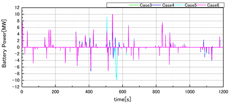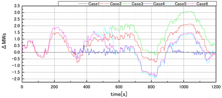 The simulation results are shown in Figures 22-25 and Table 6. Figure 22 shows the frequency responses of System A in the 6 cases. Figure 23 shows the HVDC transmission line power. Figure 24 shows the battery power (positive value corresponds to charging). Figure 25 shows the transmitted energy deviation, ΔMWs, obtained from Equation (7). Table 6 shows the maximum deviation and the standard deviation of the frequency fluctuation of System A.