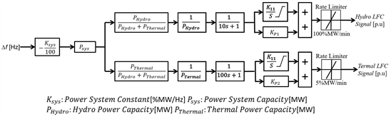 Input values of 65M and 77M are shown in Table 2. LFC system supplies output command signal to the LFC power plants according to the system frequency deviation. The LFC signal is input to 65M, and then, the output of each LFC power plant is changed. The governor models used in this paper is based on the standard models of the Institute of Electrical Engineers of Japan.